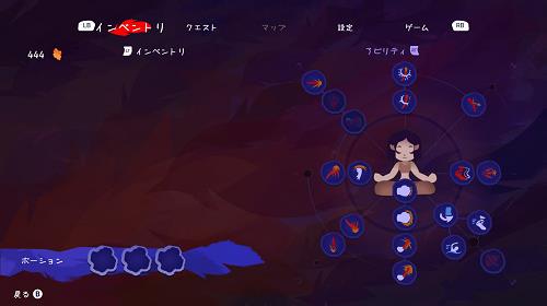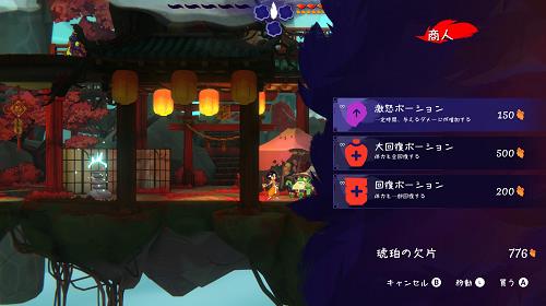 回復面では、道中の「商人」から敵を倒して手に入る「琥珀の欠片」で、ポーションを購入することが出来ました(デモ範囲)。